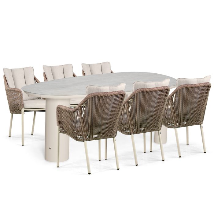 De ronde, zachte lijnen van de tafel zorgen voor een speelse en exclusieve uitstraling, terwijl de rope stoelen warmte en sfeer toevoegen aan je terras.