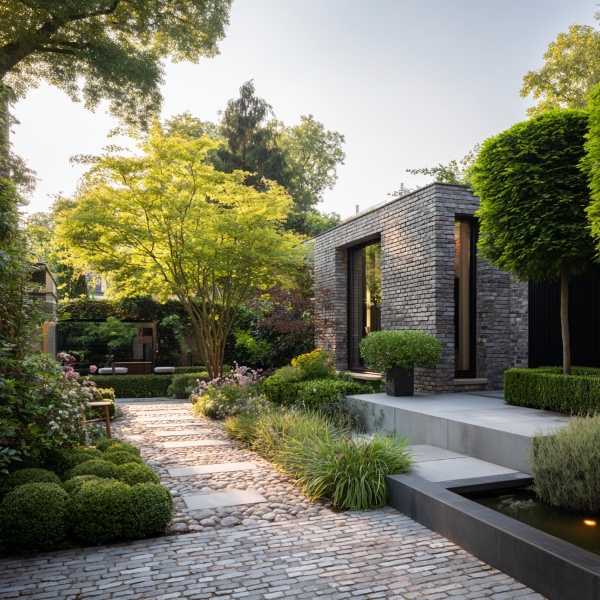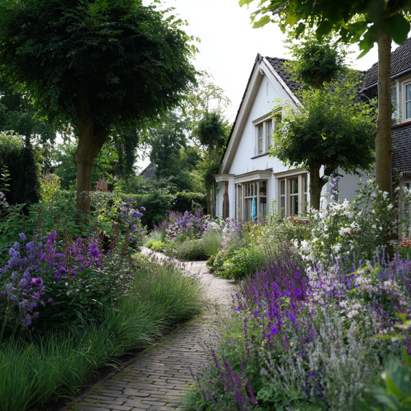 Planten brengen leven, maar in deze stijl kies je bewust. Geen tropische bloemen, maar sobere soorten met natuurlijke tinten. Denk aan lavendel, siergrassen, varens, salie en zilverkleurig blad. Een paar dennen of berken zorgen voor structuur en hoogte. Combineer deze met lage borders of potten in grijs of zandkleur. Het resultaat? Een tuin die rustig oogt, maar wel "levend" vanwege de wind die de hoge planten laat bewegen.